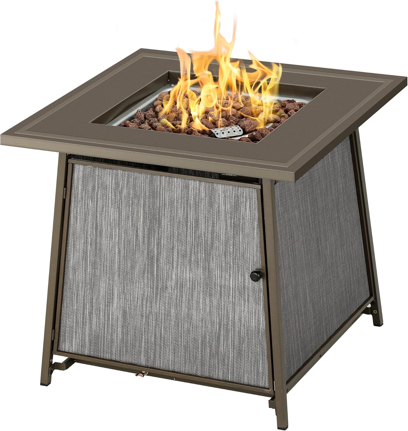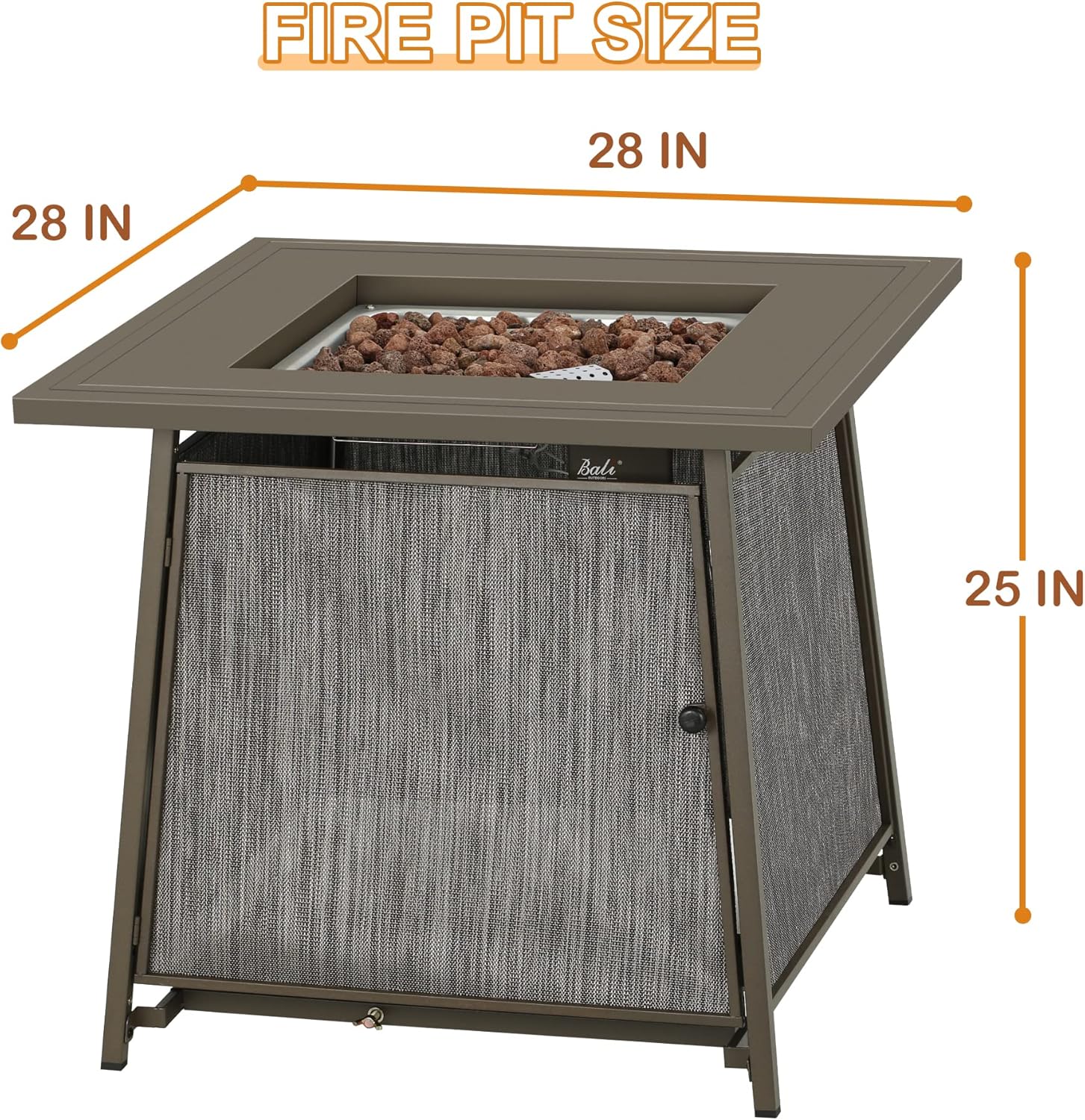 - Square 28-inch propane fire pit table (frame with gray panels)